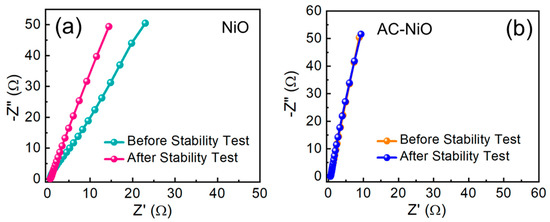 Finally, the EIS measurements were performed at 1 Hz to 10 kHz to investigate the catalytic kinetic reaction of the electrodes. Figure 7a,b displays the Nyquist plots of the NiO and the AC-NiO OER electrodes, respectively. In both cases, the EIS spectra exhibited a linear feature in the low frequency region because of the dispersion of electrolyte within the electrode. Here, it should be noticeable that no semicircles were observable in the high frequency region. Since the semicircle was related to the charge transfer resistance [38,42] as well as the series resistance, the absence of the semicircle presents the decreases in both the electronic and the ionic resistance in the electrochemical scheme [63,64]. For the NiO and the AC-NiO OER electrodes, the series resistance values were determined to be 2.16 and 1.57 Ω, respectively. Therefore, we could conclude that the enhanced OER performances originated from the higher electrical conductivity and the lower ionic resistance in the AC-NiO nanocomposite system.