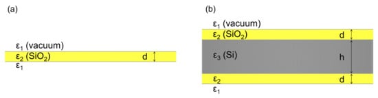 Figure 1a shows the scheme of a single suspended film of thickness d, surrounded by vacuum, and Figure 1b displays the specific structure of a Si layer of thickness h, sandwiched between SiO films of thickness d. The SiO films and Si are assumed to be nonmagnetic (Relative magnetic permeability ). The SiO has a frequency-dependent relative permittivity , while Si has a relative permittivity of , which assumed as non-absorptive in the infrared range, surrounded by non-absorptive media with a permittivity of such as vacuum. The thermal conductance generated by SPhPs in this structure G is given by [11],