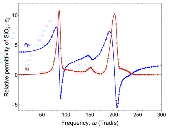Here, we consider silicon dioxide (SiO) as the polariton active media. The relative permittivity of SiO is complex and frequency-dependent. The real part and imaginary part of the relative permittivity () of SiO can be obtained from experimental data reported for the complex index of refraction [28], as shown in Figure 2.