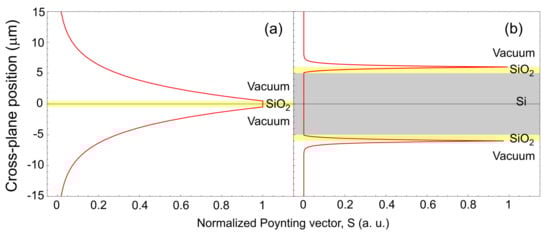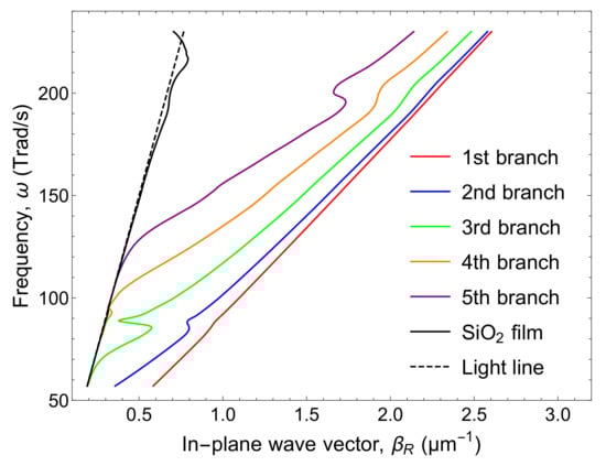 Dispersion relations of SPhPs propagating along a SiO (1 m)/Si (10 m)/SiO (1 m) structure.