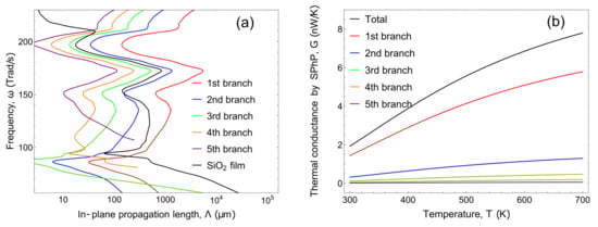 The in-plane propagation length of each branch is plotted in Figure 4a. The first branch has the longest propagation length at frequencies above 90 Trad/s and this latter length is even longer than the in-plane propagation length of SPhPs in a single SiO film. This behavior leads to the high thermal conductance of the first branch in the structure.