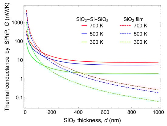 For comparison, we calculated the thermal conductance dependence on the SiO thickness, shown in Figure 5. The SiO thickness is varied from 1 m down to 10 nm and both the thermal conductance by SPhPs of the three-layer structure and of the single SiO film are plotted. The thermal conductance of the three-layer structure is higher than that of the single SiO film for SiO film thickness > 150 nm. When the SiO film is thicker than 600 nm, the thermal conductance is more than one order of magnitude higher than that of the single SiO film.