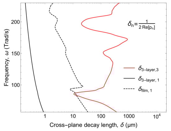 Cross-plane decay length in different media: Si (red solid line) and vacuum (black solid line) of the three-layer structure, and vacuum in the vicinity of the single film structure (black dashed line).