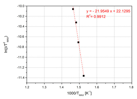According to the KM model, the activation energy, E, can be evaluated by the linear plot of ln(β/T2MAX) vs. 1/TMAX [26,27], as follows:
