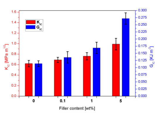 Fracture toughness tests were performed by using SENB specimens in a 3-point bending configuration, according to the ASTM D5045 test standard. The cross-head displacement rate employed is 10 mm·min−1. During the 3-point bending tests for the determination of fracture toughness properties, all samples (neat epoxy and nanocomposites) exhibited a typical linear load-displacement behavior up to failure. The maximum loads were used to evaluate the fracture toughness together with the initial crack length and the sample dimensions. Two main parameters describe the fracture toughness performances of a material—KIC, which represents the critical stress amplification factor near the edge of a crack, and GIC, which is the energy for creating two surfaces during the fracture propagation.