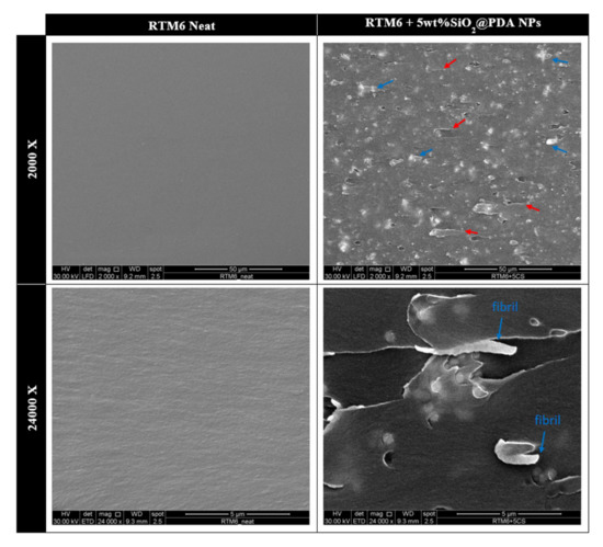 In order to assess the micro-mechanical mechanisms of failure, the fracture surfaces of tested samples were analyzed using SEM, as shown in Figure 11. The neat epoxy fracture surface appears extremely smooth, indicating the brittle nature of the epoxy matrix. The addition of 5 wt% SiO2@PDA remarkably increases the roughness of the fracture surfaces and, in particular, two main features can be highlighted—crack pinning tails (red arrows), associated with the crack pinning mechanism, and plastic deformation areas/fibrils (blue arrows), attributable to the plastic deformation mechanism. These characteristics are in agreement with the previously purposed fracture mechanisms, supporting the large increase in critical released energy during the formation of new surfaces compared to the neat matrix.
