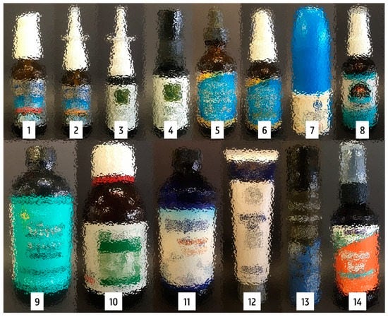 Commercially available silver-containing products were selected and purchased from the internet. Fourteen products were ordered from 10 different brands. The different products are shown in Figure 1, and in Table 1 and Table 2, important label information is listed. For products 5, 6, 8, and 9, three different production batches were ordered. All products were advertised as containing a certain solid form of silver, indicated as metallic silver (Ag0), colloidal silver, silver hydrosol, or silver (nano)particles, regardless of whether the silver was in combination with soluble ionic silver (Ag+). Colloidal silver is a dispersion of metallic silver particles in a liquid. These particles are defined as having a dimension within the size range of 1–1000 nm [11,12,13]. Silver hydrosol is regarded as the purest form of a silver colloid, with water as the liquid phase [43,44]. Nanoparticles are defined as materials where 50% or more of the particles—in an unbound state, as an aggregate or an agglomerate—have one or more external dimensions in the size range of 1–100 nm [14,15].