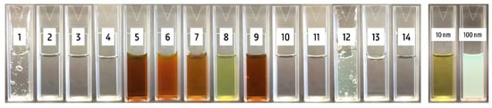 Figure 2 shows a visual analysis of the 14 products and the references of 10 and 100 nm silver particle suspensions. The AgNPs of 10 nm had a bright yellow color, while the larger AgNPs of 100 nm were cloudier and had a white-gray color. Product 8 was bright yellow, while products 5, 6, 7, and 9 had a dark orange color, with slide cloudiness in product 6. Product 12 was a gel and displayed a light yellow and more cloudy color. All other products were colorless. The color difference between the different production batches of products 5, 6, 8, and 9 is represented in Figure 3. No batch difference was observed for products 5 and 6, while a remarkable difference was observed for product 8, where batch 2 was colorless. For product 9, batch 1 had a darker orange color compared with the two other batches.