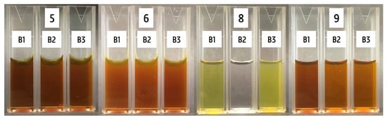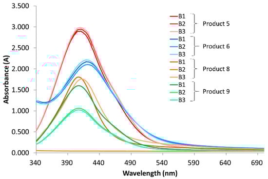 The spectra of the different production batches of products 5, 6, 8, and 9 are represented in Figure 5. No difference is observed for batches 1, 2, and 3 of products 5 and 6. Concerning product 8, batch 2 displayed a negligible signal for all tested wavelengths, which was consistent with the visual observation, because batch 2 was colorless. The spectra of batches 1 and 3 were similar, with only a small increase in the wavelength of λmax from 407 to 412 nm. The absorbance maximum of batch 1 of product 9 was higher compared with batches 2 and 3. However, the wavelength of this maximum remained unchanged at 407 nm. This analysis corroborated that the color of the first batch of product 9 was more intense than the other ones.