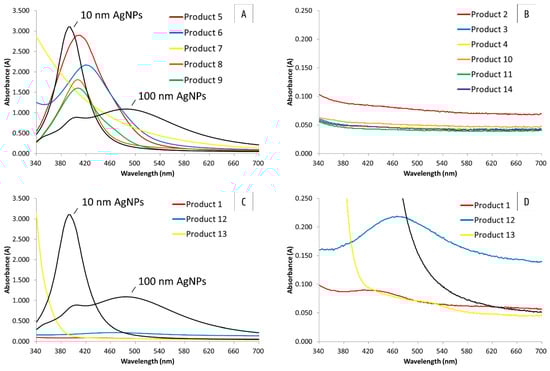 Absorbance spectra of product 5, 6, 7, 8, and 9 (A); product 2, 3, 4, 10, 11, and 14 (B); and product 1, 12, and 13 (C,D) compared with the absorbance spectra of 10 and 100 nm AgNPs of Nanocomposix with a concentration of 20 mg L-1. Batch 1 is represented for products 5, 6, 8, and 9. Products 5 and 6 were diluted with a 1:10 ratio and products 7 and 8 with a 1:2 ratio, and a 1:20 dilution of product 9 was measured.