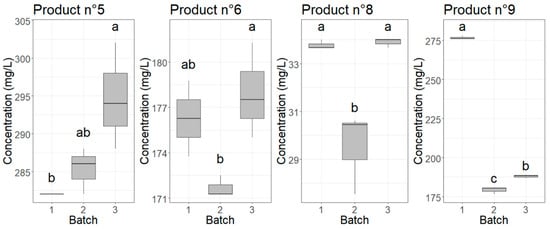Boxplots showing the variation in measured concentration for the products from which different batches were analyzed. Different letters above the boxes point to significant differences (p-value < 0.05) between batches according to a Tukey test.