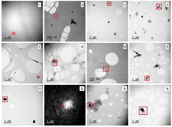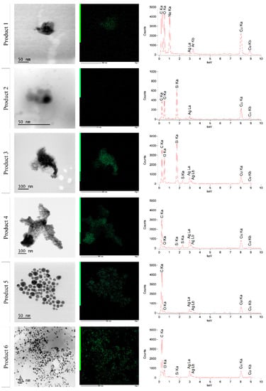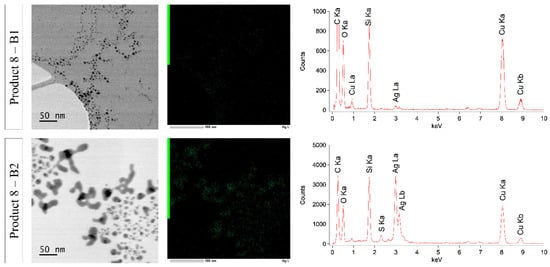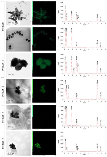 Figure 8 and Figure 9 show the STEM-EDX results of products 1–6 and products 9 and 11–14, respectively. The characteristic X-rays were measured over a range of 0 to 20.470 keV. Because only background counts were detected from 10 keV, data of 0 to 10 keV are shown. For all products, carbon (C Ka–0.277 kV) and copper (Cu Ka–8.040 kV and Cu Kb–8.904 kV) were detected. These signals were derived from the used carbon-coated copper grid. Beside this, the presence of oxygen (O Ka–0.525 kV) was measured in all products. This oxygen is at least partly due to the insertion of the specimen holder in the STEM, leading to an interference of ambient air in the vacuum of the STEM. In all analyzed products, the presence of silver was confirmed by the Ag La (2.984 kV) (and Ag Lb (3.150 kV)) peak in the spectrum. The location of the green dots of silver in Figure 8 and Figure 9 indicated that the silver was present within the particle structure, with the exception of products 2 and 13, where the silver counts were much lower and the presence of silver within the particle could not be confirmed. Additionally, sodium (Na Ka–1.041 kV) and sulfur (S Ka–2.307 kV) were detected in products 1 and 12 and in products 3, 4, and 11, respectively. Moreover, the argon plasma cleaning led to the presence of an argon (Ar Kb–3.190 kV) peak in product 1. It was remarkable that silicon (Si Ka–1.739 kV) was apparently detected in most analyzed samples, with the exception of products 1, 5, 12, and 14, where no Si Ka peak was measured.