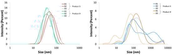 Intensity size distribution of the three different batches of products 5 and 9 (left) and products 6 and 8 (right), excluding batch 2 of product 8, which is represented in Figure S1 (SI section).