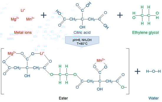 Schematic representation of condensation process between metal cations (Li+, Mg2+, and Mn2+), citric acid, and ethylene glycol from the initial stage of the Pechini-type sol–gel method.