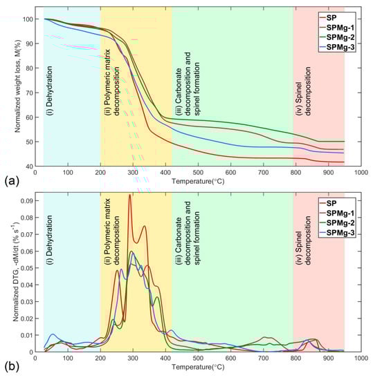 Initially, experimental data of thermogravimetry (TG) and its derivatives (DTG) were normalized using Equations (7) and (8), respectively, in order to standardize mass-loss curves of precursors with different magnesium concentrations. Normalized TG was represented by M, where is the mass in time (t) and the initial mass at 25 °C. Normalized DTG was represented by , where corresponds to experimental DTG in mg s−1: