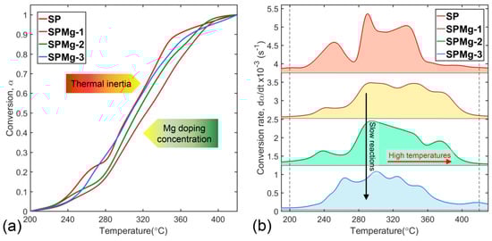 Curves of (a) conversion and (b) conversion rates’ evolution of synthesis precursors with different magnesium doping concentrations.