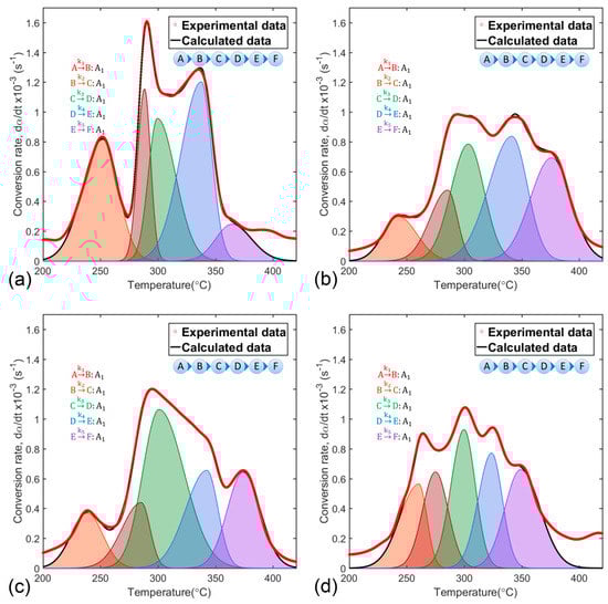 To quantify the effect of magnesium doping concentration on polymeric matrix thermal decomposition, complex solid-state reactions represented by conversion rate curves (Figure 3b) were separated into five single-stage reactions using the deconvolution function of Equation (6).