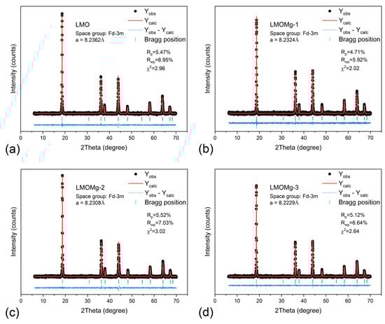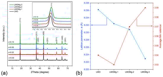 Partial substitution of Mn3+ ions increases oxidation state of Mn in bulk LMO resulting in a strengthening of chemical bond between metal ions and oxide due to stronger chemical bonds of dopant, which prevent Mn3+ ions’ dissolution in electrolyte through dismutation reaction, and suppression of Jahn-Teller distortion []. Cation doping includes Li+, Ni2+, Zn2+, Mg2+, Al3+, Cr3+, Co3+, Ga3+, Ti4+, etc. []. Among potential doping elements, a transition nonmetal like Mg attracted a lot of attention due to its good electronic conductivity and its ability to stabilize the LMO host crystal structure [,,,,,,,,,] in addition to having many advantages, such as abundance, nontoxicity, low cost, and being lighter than transition metal elements.
