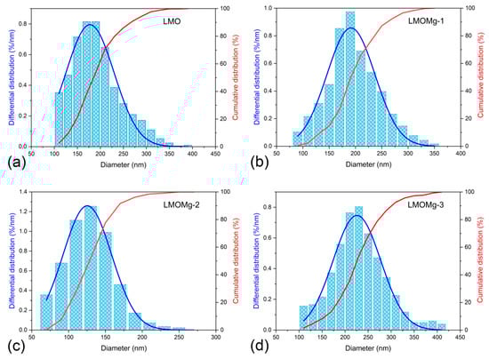 Considering different magnesium concentrations used as doping agent, the thermal decomposition of synthesis precursors, at a heating rate of 10 °C min−1 in a temperature range of 25 °C to 950 °C, was divided into four roughly separate zones: (1) Dehydration, (2) polymeric matrix decomposition, (3) carbonate decomposition and spinel formation, and (4) spinel decomposition. Figure 2a,b presents normalized mass-loss curves (M) and its derivative () as a function of temperature according to Equations (1) and (2), respectively.