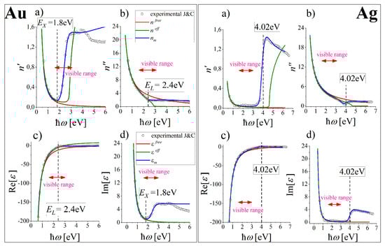 , and (Equations (1)–(3)) and the corresponding real and imaginary parts of the indexes of refraction fitted to both and are presented with red, green and blue lines correspondingly. Vertical lines mark the threshold energies for interband transitions for gold [50,52] and silver.