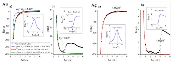 which we propose in this work for gold ( = 8.6 eV and = 0.072 eV) and silver ( = 9.0 eV and = 0.02 eV) allow to reproduce very well the low and high frequency range of dependence in its real part (Figure 1c), red lines) and the low range frequency dependence in the imaginary part (Figure 1d), red lines) in gold and silver (left and right panels respectively). Accepted parameters for gold allow a good reproduction of and in the frequency range up to about 1.1 eV and and up to about 1.8 eV (red lines, left panel of Figure 2). Therefore, the modeling of properties of plasmonic materials with the use of in gold can be fully reliable in the IR range, which can be eventually extended up to 1.8 eV for quantities which are mainly defined by . For silver (see the right panel of Figure 2) the limiting spectral range of applicability of ends at about 3.39 eV with little inaccuracy in the range from 1.7 eV up to 3.39 eV for and and about 2 eV for and .