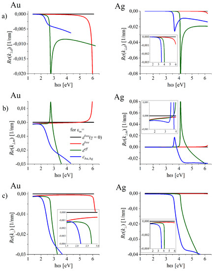 The components and functions which are the measure of SPP localization, are illustrated in Figure 6a,b for all the studied models of the dielectric functions for gold (left column) and silver (right column) interfaces. The spectral range of relatively good localization of SW (small ) is dramatically reduced, when the interband transitions (green and blue lines) are accounted for in addition to ohmic losses included in (red line) even in the smallest frequency range. The SPP mode is more tightly bound to the surface from the dielectric side. The silver interface allows much better localization than the gold one over full optical range (between 1.6 eV and 3.1 eV).