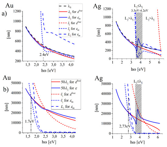 Figure 8a illustrate the wavelength of the surface wave propagating along the interface found for realistic lossy metals (solid blue lines) and for free-electron metal (red solid lines). The corresponding long-dashed lines illustrate the LSP oscillation length defined as the propagation distance over which the field amplitude decays to 1/e of its original value: