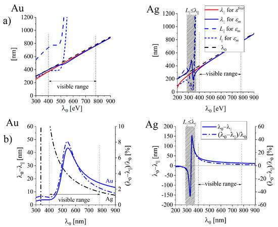 If gold and silver were metals that meet these assumptions, the dispersion relations (Equations (8) and (9)) (and the resulting LSP properties) would be like those illustrated in Figure 4a (black solid lines for well hidden under the increasing part of the red line representing the expectations for .