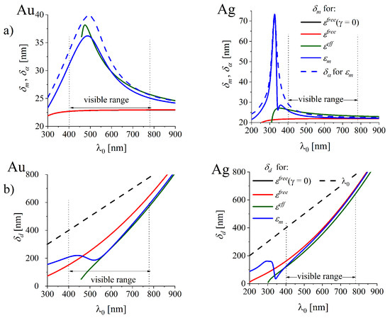 The real parts of dependence (Equation (8)) which correspond to the condition (12) are presented in Figure 4a for all the considered models of DFs. In the lowest frequency range, (blue solid line in Figure 4a) almost follows the light-line (marked with dashed black line). At these frequencies the wave propagating along the interface is grazing the surface like in the simplified modeling (black, red and green solid lines). With increasing frequency, the dispersion relation (blue lines in Figure 4) moves further away from the light-line. In case of silver, the distinct local maximum of is reached. With still increasing frequency, DR displays a “turn-back” and crosses the light-line. Similar crossings can be observed also in free-electron metal (black and red lines) over the frequency equal or close to and for modeling using (see Figure 4a), green lines) over (2.8 eV for gold, and 4.1 eV for silver in very far ultraviolet). The important discrepancies of the exact modeling (blue lines) and those resulting from the simplified ones (black, red, and green lines) prove that near and over these frequencies, such simplified modeling is not applicable. In particular, the value is often quoted as a frequency that corresponds to “the resonance frequency” of SPP, is obtained with the models of DFs (black and red lines) which do not apply in such high-frequency range as there are no real metals that can be described by those. Let us also note that the estimation of the maximal shortening of the SPP wavelength within modeling using in Reference [42] can not be reliable from the same reason.