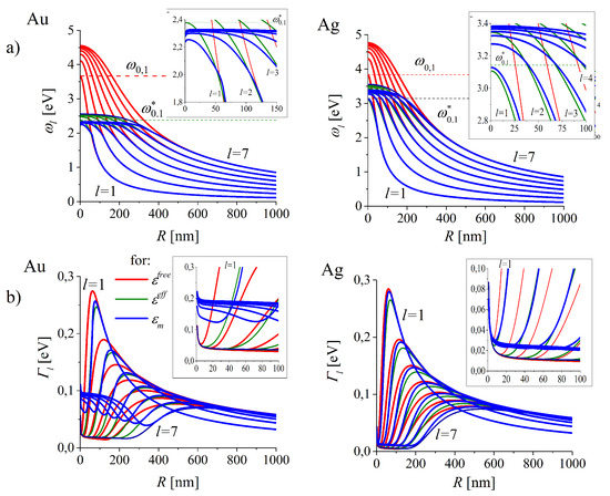 The effective parameters which we accept for gold are [43,63,64]: , = 9.010 eV and = 0.072 eV and for silver [63,64,65]: , = 8.9 eV and = 0.02 eV.