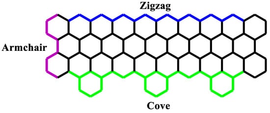 Recently, bottom-up synthesis of graphene allowed a configuration of GNR with cove-typed edges [2]. Cove-edged graphene nanoribbons (CGNRs) are a class of nanoribbons with asymmetric edges composed of a repetition of hexagons and vacancies, as shown in green in Figure 1. The cove-typed edges were observed along the zigzag GNR (ZGNR). Since their synthesis, they have been used in several interesting studies involving electronic [15,16,17] and chemical [18,19] applications.