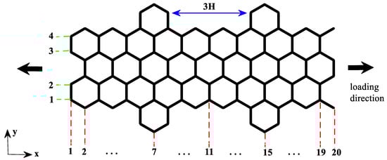 Figure 2 shows a schematic of cove-edged graphene nanoribbon. The parameter NW corresponds to the number of carbon–carbon dimer lines along the ribbon width (y direction), while the parameter NL corresponds to the number of carbon–carbon dimer lines along the ribbon length (x direction). This convention is in concordance with previous studies [18,44,45]. The NW and NL parameters define the CGNR size. The example in Figure 2 corresponds to NW = 4 and NL = 20. The parameter nH corresponds to the distance between the hexagons at cove-typed edges. For example, 3H means that three hexagons are missing; this parameter is used to represent the cove configuration of the edges. To study the mechanical response of a CGNR, the periodic boundary conditions are considered in the x-direction. Uniaxial tension tests are simulated along the zigzag direction by applying strain at a rate of 0.001 ps−1 in the x-direction. All molecular dynamics (MD) simulations are carried out at temperature of 1 K with temperature controlled by the Nose-Hoover thermostat. This thermostat has been widely used for carbon systems and is known to yield stable and efficient computations [20,21,22,24,37,40,44]. The timestep was 0.5 fs and a uniaxial tension was applied after the system was relaxed at zero pressure through isothermal–isobaric ensemble (NPT).