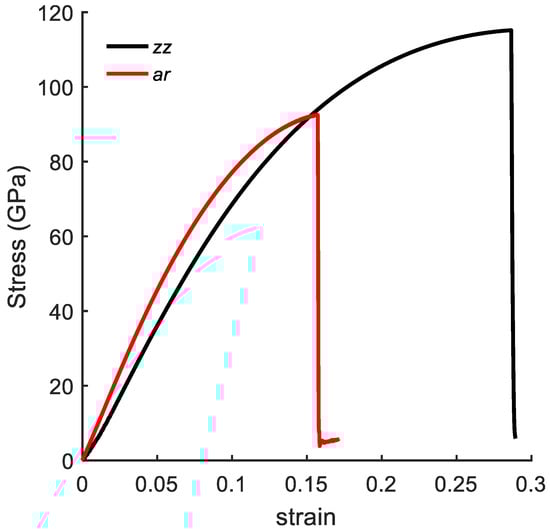 Stress–strain curves of pristine graphene sheet under uniaxial tension along ar and zz directions.