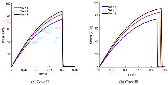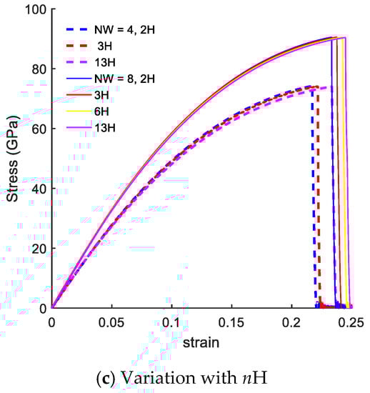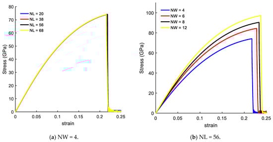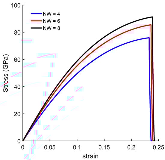 Figure 4 presents the size effects on the mechanical response of CGNR in a form of stress–strain curves. Figure 4a shows the stress–strain curves with fixed width of NW = 4, and length varying from NL = 20–68. The mechanical response of CGNR shows hardly any dependency on the length as the periodic boundary conditions were used in the length direction. Such behaviour also confirms the validity and correct physical response of the MD model of CGNR. Moreover, this behaviour was similar to the response previously observed for AGNR and ZGNR [21].