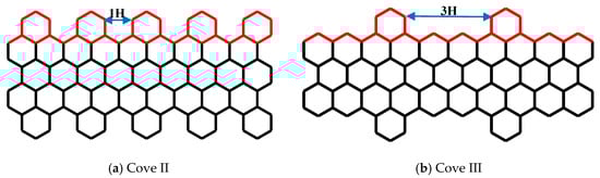 The results presented in Figure 4 show that the edges played a different role on the mechanical response of CGNR when compared to the effect of edges on the response of AGNR and ZGNR. In this regard, it is important to examine how the behaviour observed in Figure 4 depended on the cove-edge configuration shown in Figure 2 (i.e., the distance between the hexagons). Therefore, in the next example, we investigated the influence of parameter nH by comparing the results for 1H and 3H. For each parameter nH, the CGNR length was fixed with NL = 56 and the width (NW) varies from 4 to 8. These two configurations were called Cove II and Cove III as shown in Figure 5a,b, respectively. In addition, we investigated the influence of higher values of the parameter nH by considering CGNRs with NL = 56 and NW = 4 and NW = 8.