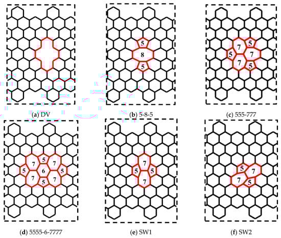 In this section, the effects of the topological and vacancy defects on the mechanical behaviour of CGNR were presented. The topological defects break the symmetry of the hexagonal lattice, while the sp2 covalent bonds were maintained. The vacancy defects were obtained by removing atoms from the lattice and as a result the sp2 covalent bonds around the defects were not maintained. The topological and vacancy defects considered in this study are shown in Figure 8. Figure 8a shows a divacancy (DV) defect obtained by removing two atoms from the center of the lattice. Figure 8b–d shows topological defects known as 5-8-5, 555-777 and 5555-6-7777. Figure 8e,f shows the Stone–Wales defects commonly identified as SW1 and SW2. To study the effect of defects on the mechanical behaviour of CGNR, each defect shown in Figure 8 was placed at the centre of a CGNR with geometry defined by NL = 56 and NW = 8. In all MD simulations, the cove-type edges had hexagons spaced at 2H, and the length of a standard carbon–carbon bond was considered initially as 1.396 Å. Note that initial bond lengths were different for certain bonds and rotated carbon–carbon bonds associated with topological defects.