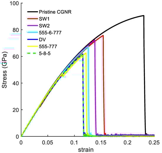 Stress–strain curves for the defects: DV, 5-8-5, 555-777, 5555-6-7777, SW1, and SW2.defects.