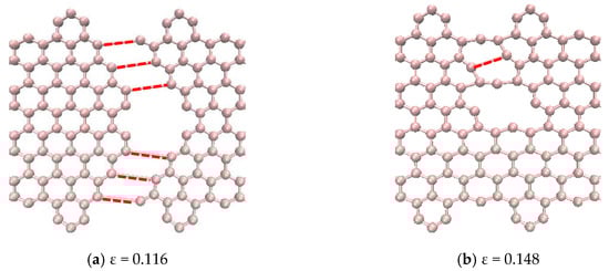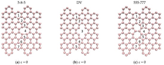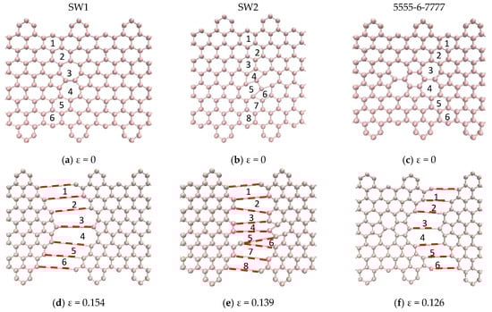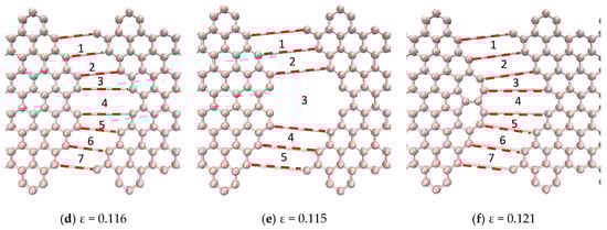 The defects shown in Figure 11a–c had similar fracture propagation as in Figure 10. Here again, the red broken lines illustrate the broken bonds of the system, but they do not represent the actual bond lengths. Fracture propagates through both sides turning to the left side reaching the edges in the interval between of the hexagons. For the 5-8-5 defect, the fracture started on the bonds shared by the pentagon–octagon and the pentagon–hexagon and these bonds aligned with the loading direction relatively easily. In the case of the DV defect, the fracture started on the bonds shared by the vacancy and the hexagons. It obviously had the least resistance to failure as only six bonds were involved, and they aligned easily with the loading direction. The fracture in the 555-777 defect started on the bonds shared by the pentagon–heptagon and pentagon–hexagon. It is interesting to note that in the case of the 555-777 defect, the fracture could start on the bonds shared by the heptagon–heptagon and heptagon–hexagon as in the case of SW1 and 5555-6-7777 defects. However, due to the atomic configuration of the 555-777 defect the fracture started at different bonds. However, its strength and fracture strains were quite close to the values of 5555-6-7777 defect and slightly higher than the DV and 5-8-5 defects.
