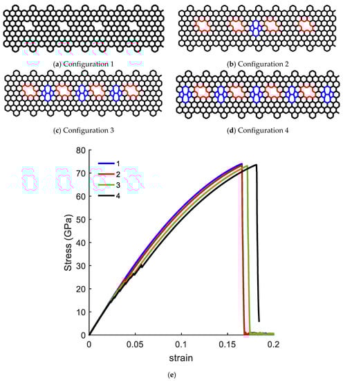In the next example, the influence of a network of simple defects was examined to further explore the emerging idea of topological design of 2D materials. We considered a CGNR with a set of inclined DV defects (DV6 configuration in Figure 12 and added SW1 defects to examine the response of the resulting CGNR. Four configurations of CGNR were considered as shown in Figure 15a–d. The mechanical response of these configurations was presented in Figure 15e. The results revealed an interesting behaviour with the combination of the defects. The ultimate strength practically remained the same as the number of SW1 increased, whereas the fracture strain had a noticeable increase. Therefore, it is concluded that the combination of inclined DV and SW1 defects could increase the mechanical flexibility without compromising the stiffness of CGNR.