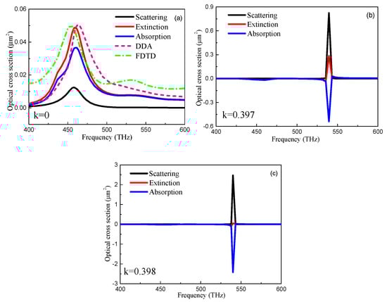 Calculated optical cross-section spectra of the core-shell nanocube dimer with a different coefficient κ in the core. (a) κ = 0 (b) κ = 0.397 (c) κ = 0.398.