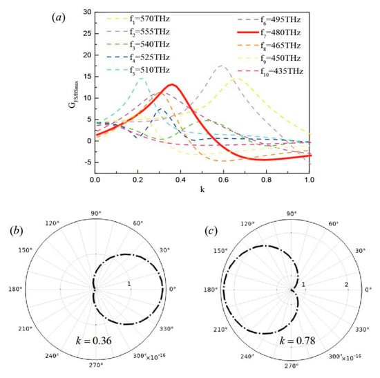 According to the discussion above, the core-shell nanocube dimer with balanced gain and loss at was chosen to study unidirectional scattering. The far-field scattering patterns for the coefficient κ in the core as a function of frequency around are shown in Figure 3a. The far-field forward-to-backward directionality of the core-shell nanocube dimer with balanced gain and loss in dB can be obtained by , where is the amplitude of the power radiated in the forward () and backward () directions [34,35]. The direction of the scattered wave changes as the coefficient κ in the core is varied. For example, by changing the frequency between and , the directionality was altered. In particular, the bold curve at the frequency of exhibited pronounced directionality towards the opposite direction. The coefficient κ = 0.36 in the forward direction was about 14 dB stronger than in the backward direction and that of κ = 0.78 was directed toward the backward direction and about 5 dB stronger than in the forward direction. In general, the bold curve at the frequency of satisfied the largest change in directionality and a change in magnitude from negative to positive. Figure 3b,c further shows that the scattering direction of the antenna at a fixed frequency can be reversed by adjusting κ. This shows switchable and highly directional radiation for different coefficient κ values in the core originating from constructive and destructive interference in the backward and forward radiation [36]. This was set as the default frequency in our calculation and the directionality can be tuned by the frequency. To clarify the influence of the geometry on the far-field scattering patterns for the coefficient κ in the core, a systematic investigation was performed by varying three parameters d, l, a. The corresponding models were optimized, and the calculated spectra show the different scattering effects for the directions (see Supplementary Figure S1). The directionality reached the maximum and a high directivity of scattering could be achieved when d, l, a were 50 nm, 40 nm, and 20 nm, respectively. Therefore, the directionality is described based on geometric parameter optimization to realize superior directionality towards the opposite direction.