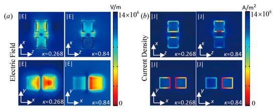 To obtain more information about the optical properties of the core-shell nanocube dimer, the electric field distribution and current density at κ = 0.268 and κ = 0.84 are presented in Figure 6. The near-field distributions were determined by electric dipolar excitation of the core-shell nanocube dimer. For the x-z plane, the electric field hotspot occurred naturally at the corner region and the inner core (Figure 6a). The electric field magnitude on the two sides of the core-shell nanocube dimer for the x-y plane was at κ = 0.268 and the field was dispersed on the entire surface of the gain part at κ = 0.84. There was strong field localization and the electric field enhancement stimulated the optical response in the nanoantenna. At the same time, a large portion of the electromagnetic energy was localized at the outer cubic Au nanobox (Figure 6b) and the peak and valley at and were derived from the interaction of the electric dipoles according to the current density distributions.