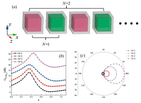 To benchmark our numerical calculation, we calculated the power difference with an analytic dipole model for the far-field directionality of the core-shell nanocube dimer with balanced gain and loss [37]. The two emitting dipoles with moments defined as and , were positioned on the -x axis and +x axis, respectively. Their y-coordinates were and , respectively (see Figure 4a). In the far-field limit ( ⪢ ),