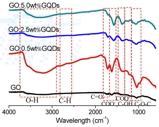 FTIR spectra of GO, and GO:GQDs nanocomposites.