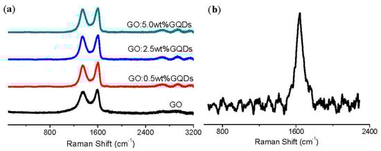 (a) Raman spectra of GO and its nanocomposites with different content of GQDs 0.5 wt%, 2.5 wt%, and 5.0 wt%, respectively; (b) Raman spectrum of GQDs aqueous dispersion.