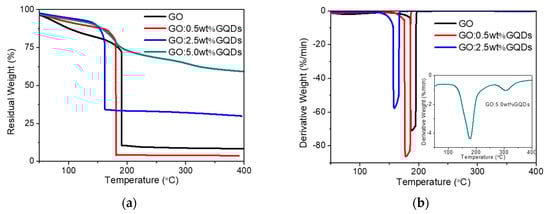 The thermal stability of GO and GO:GQDs nanocomposites were investigated by TGA in N2 atmosphere (Figure 3). GO was thermally unstable and started to lose mass upon heating below 100 °C because of the adsorbed water molecules. There were two significant steps in mass around the range from 165 °C to 200 °C, which were assigned to the elimination of oxygenated functional groups of GO. A weak mass loss in the range of 250–400 °C was related to the elimination of more stable functional groups. The residual weight of about 8% was obtained, exhibiting that most of GO was burned into volatile gases. Compared with GO, the GO:GQDs nanocomposites showed lower weight loss at the three stages. This was attributed to the presence of more stable oxide groups on the GO:GQDs nanocomposite surface than GO [35]. The remaining weight at 400 °C was about 4%, 30%, and 59% for GO:0.5 wt%GQDs, GO:2.5 wt%GQDs and GO:5.0 wt%GQDs nanocomposites, respectively. The addition of 0.5 wt% GQDs adversely affected the thermal stability of GO when it might be derived from the interaction between GO and GQDs.