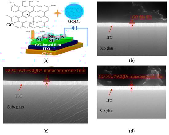 (a) Sandwiched scheme of ITO/GO-based/Ni together with structure of chemical component GO and GQDs; (b–d) SEM images for the cross-sectional characterization of GO, GO:0.5 wt%GQDs, and GO:5.0 wt%GQDs nanocomposite thin films spin-coated onto ITO/glass substrates, respectively.