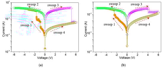 Inorganic, polymeric, and organic materials predominantly have been found to exhibit memristor properties [8,9,10]. Most of them, nevertheless, are suitable for binary systems based on electrical bistability. Namely, the data storage capacity is limited in 2n. It is essential for developing highly integrated memory devices [11,12,13,14], that multi-bit operation is confronted with currently available commercial memory devices to allow the capacity for more than one bit (a digital state of ‘0’ or ‘1’) in a particular memory cell.