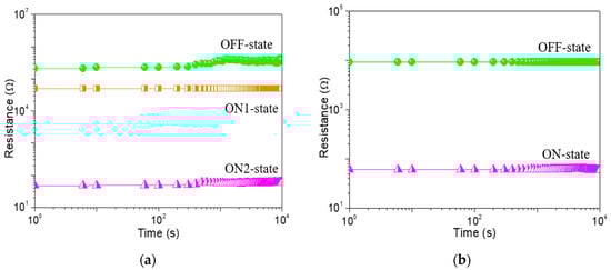 Retention property of (a) ITO/GO:0.5 wt%GQDs/Ni device and (b) ITO/GO/Ni. The resistance value was read at a constant voltage of −0.1 V.
