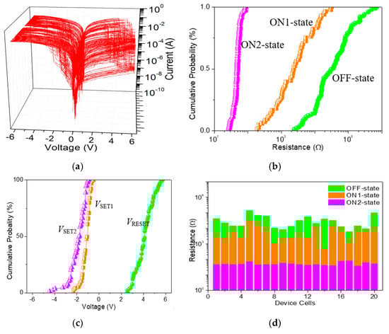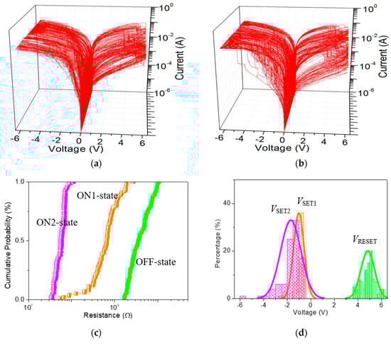 As for ITO/GO:0.5 wt%GQDs/Ni (Figure 8a), the cumulative plots of the resistance in OFF-state, ON1-state, and ON2-state (ROFF, RON1, and RON2), as well as histograms of VSET1, VSET2 and VRESET, demonstrate the data distributions during the cycle-to-cycle (C/C) operation (Figure 8b,c). The mean values (standard deviation) μ(σ) of VSET1, VSET2 and VRESET were −1.12(0.37) V, −1.88(0.69) V and 4.14(0.77) V, respectively, while that of ROFF, RON1, and RON2 were 84.6(13.3) kΩ, 5.4(7.1) kΩ, and 48.9(11.9) Ω, respectively. For device analyses of the device-to-device (D/D) operation (Figure 8d), μ(σ) for ROFF, RON1, and RON2 was 36.0(34.6) kΩ, 7.5(7.8) kΩ, and 52.5(12.6) Ω, respectively. The binary memory performance of GO (Figure 9a) was meticulously studied. The cumulative plots of the resistance in OFF and ON states (ROFF and RON), as well as histograms of VSET and VRESET, demonstrated the data distributions of ITO/GO/Ni during the C/C operation (Figure 9b,c). The μ and σ of VSET were −0.95 V and 0.45 V when that of VRESET was 4.56 V and 0.57 V. The small values of σ could be related to less spread in the distribution of VSET and VRESET. Device uniformity for ROFF and RON during the D/D performance (Figure 9d) indicated the value μ(σ) of ROFF and RON was 3.2(1.6) kΩ and 53.8(12.1) Ω, 4.5(5.4) kΩ and 72.6(21.9) Ω for C/C and D/D operations, respectively. By doping GQDs into GO, the memory performance tunable from binary to ternary was observed to assess the possible application of the GO-based nanocomposite in all-inorganic, multi-bit resistive random-access memory (RRAM).